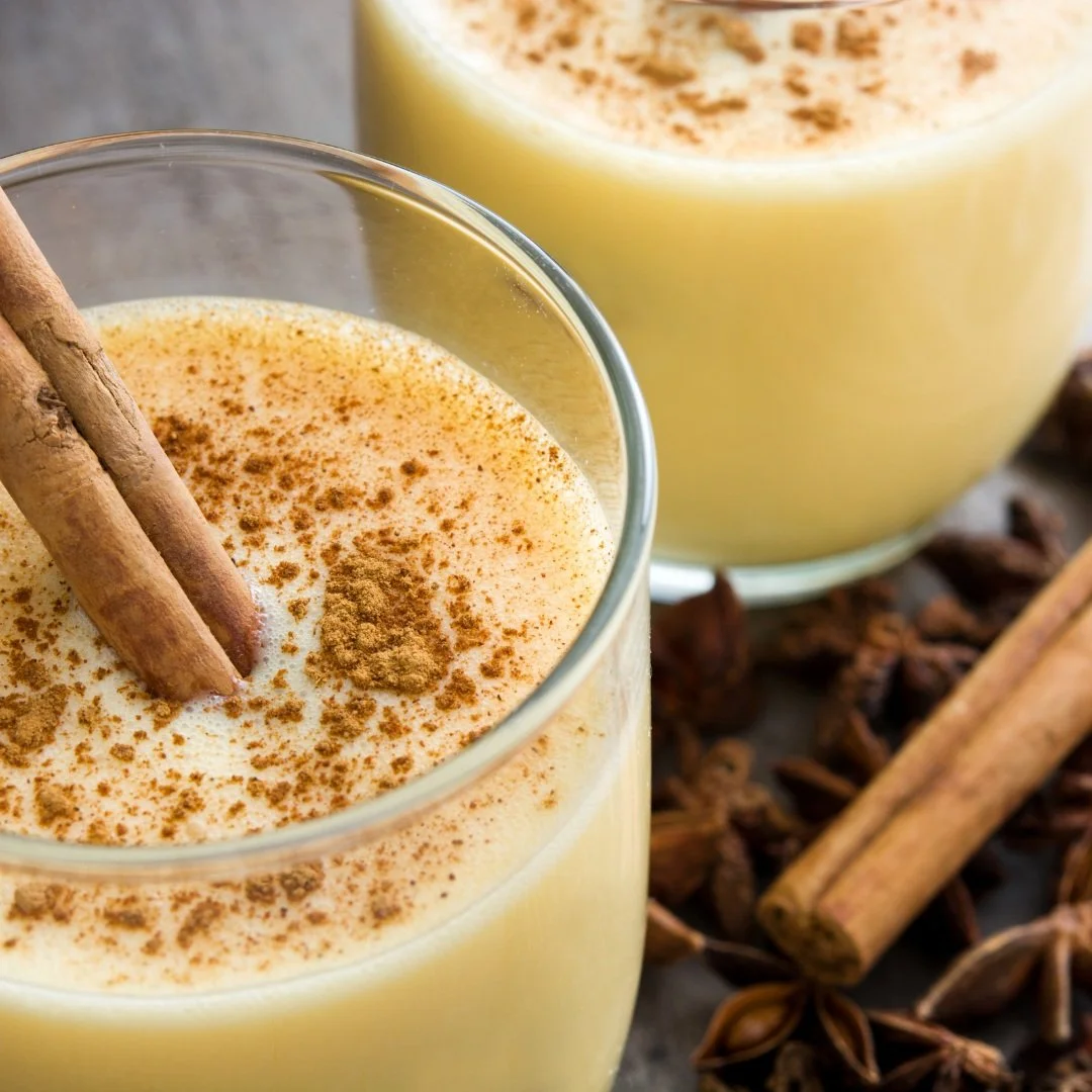 Garnish with freshly grated spice like Nutmeg or Cinnamon, and a whole cinnamon stick