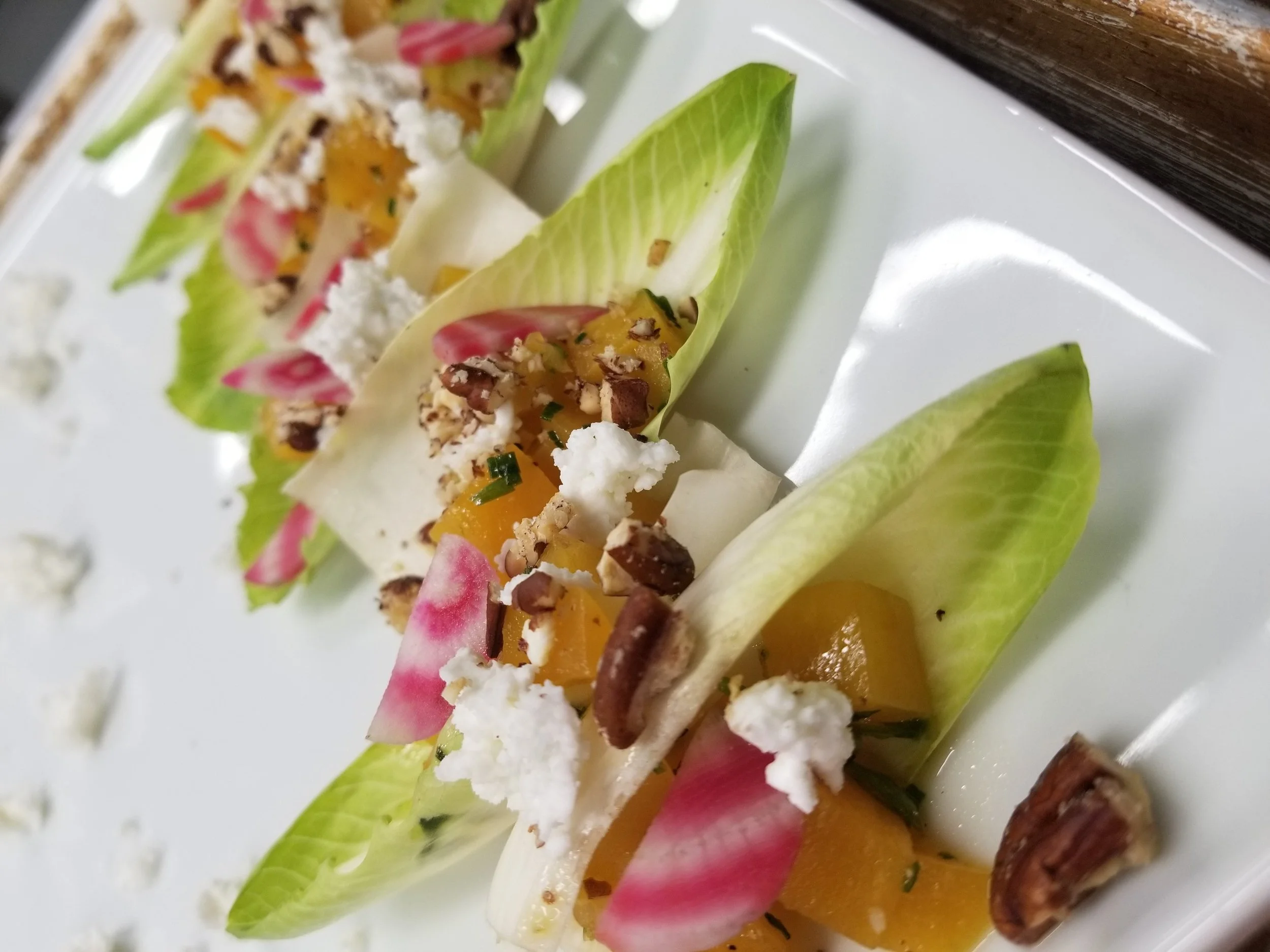 Remove any discoloured outer leaves of endive. Trim the endive into 2-3 inch pieces, discarding the tough lower part of the leaves (closer to the stem.) Place the endive leaves inside-up (creating “spoons” for your canape.) Place a small bite-sized amount of the beets mixture onto the middle of each endive leaf. Top with crumbled feta, nuts, and more herbs. Garnish with thin slices of raw beet, and drizzle the canapes with olive oil and pomegranate molasses (or the substitutes mentioned above)